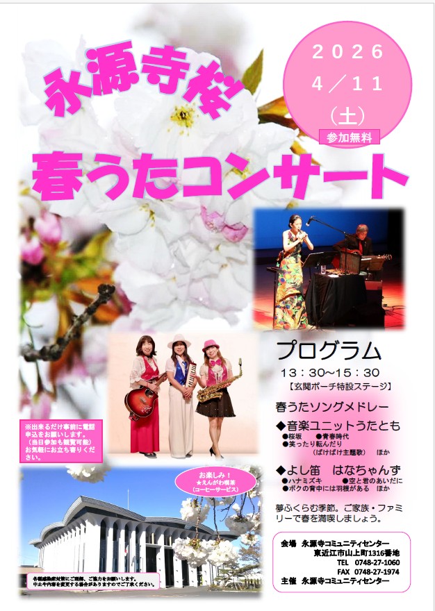 🎶 2026年4月11日(土)//13:30~ 永源寺桜 春うたコンサート ♪音楽ユニット うたとも ♪は な ち ゃ ん ず ●場所/東近江市立永源寺コミュニティセンター ●電話申込要・参加無料 ●お問い合わせ先/東近江市立永源寺コミュニティセンター ☎0748-27-1060 |